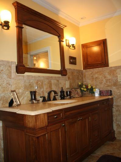 Master bath vanity and mirror in maple stained and glazed |